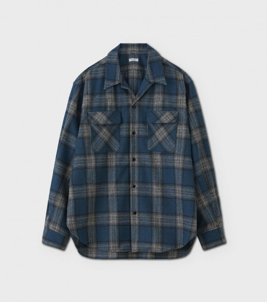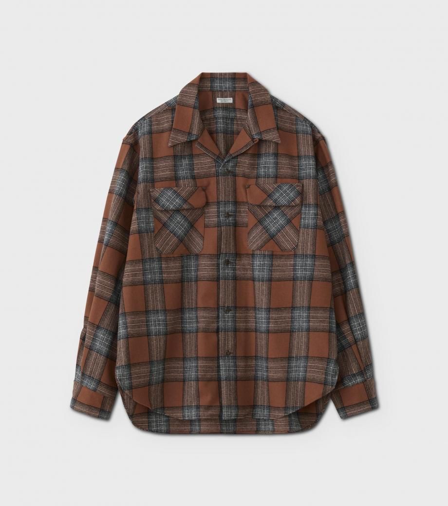 ブロックチェックオンブレー柄が特徴的なウールオープンカラーシャツ。